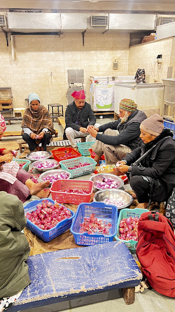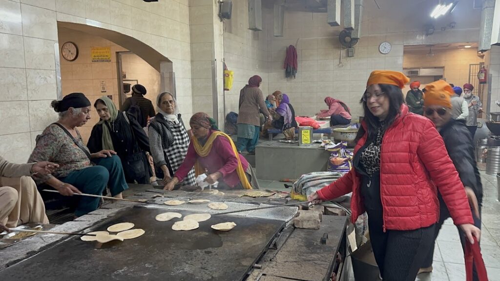 בתום אחד המזמורים הצטרפנו לאולם האוכלים. פס ארוך של מחצלת דקיקה ושחורה נפרש. ישבנו בשורה עם כולם על המחצלת, קיבלנו צלחת טאלי עם תבשיל עדשים כלשהו וצ'אפטי לניגוב. אף אחד לא הסתכל עלינו בעין עקומה למרות שהיינו המערביים היחידים באותו רגע. לאחר הארוחה יצאנו לבקר בלאנגר, הסתובבנו בין סירי הענק, בין המחסנים העצומים המאפסנים טונות של שקי אורז, קמח ועדשים ואף התנסיתי בלהפוך צ'אפטי 🙂