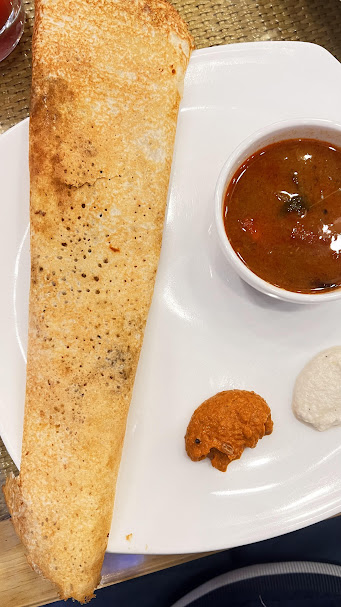 ארוחת בוקר במלון: לכל החוששים: אפשר לשרוד 🙂 ניתן להזמין ביצים לבחירה: אגס בנדיקט, אומלטים, ביצי עין, פרנץ' טוסט ושתי מנות הודיות טעימות שמתאימות גם לחיך המערבי: האחת: הטעימה והפופולארית גם במסעדות הודיות בארץ: מסאלה דוסה. מעין קרפ פריך ממולא תערובת תפוחי אדמה. מוגש עם פנכת מרק סאמבר (מרק ירקות דרום הודי ארומטי) ושני סוגים של צ'אטני. המנה השנייה: פראטה: מעין פיתה דקיקה ממולאת לבחירה בגבינה או באלו גובי (כרובית ותפוחי אדמה). שתי המנות האלה טעימות מאוד ולא חריפות.