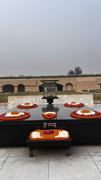 מהמולת המסגד והשוק תפסנו כמה רגעים של רוגע ושאנטי במתחם הקבר של גנדי. האיש זכה לפארק עצום ממדים בניו דלהי, מטופח ופסטורלי. יש לחלוץ נעליים בכניסה. גנדי לא באמת קבור כאן. בהתאם למסורת ההינדו גופתו נשרפה ואפרו חולק. ריבוע השיש השחור המזכיר את קבר בן גוריון, מציין את מקום שריפת גופתו.